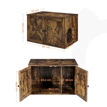 [Stilvolles Katzenklo] Mit seinem rustikalen Stil und den schicken Scheunentüren fügt sich dieses Katzenklo problemlos in die meisten Wohnstile ein und verwandelt das stille Örtchen Ihrer Katze in einen echten Blickfänger [Mehr Privatsphäre, weniger Geruch] Dank der geschlossenen Konstruktion bietet diese Katzentoilette einen privaten Ort, an dem sich Ihre Katze sicher fühlt, um ihre Notdurft zu verrichten und es entsteht weniger Schmutz – eine Win-Win-Lösung! [Geräumiger Innenraum] Mit einer Größe von 50 x 50 x 46 cm bietet das Hauptfach dieses Katzenschranks genug Platz für die meisten Katzentoiletten. Sie können auch die Trennwand entfernen, um die Fläche auf 74,9 x 50 x 46 cm zu vergrößern [Für Ihre Katze und Sie] Stellen Sie ein Katzenklo hinein, verwenden Sie es als Beistelltisch oder stellen Sie ein Katzenbett hinein, um einen gemütlichen Unterschlupf zu schaffen [Kinderleichte Montage] Ihre Katze kann es kaum erwarten, ihr neues Möbelstück auszuprobieren? Kein Problem, denn mit einer Schritt-für-Schritt-Anleitung und beschrifteten Teilen ist dieses Katzenhaus in 20 Minuten fertigFeandrea Hinweise: