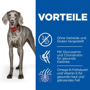 Große Hunde haben ihre ganz eigenen Ernährungsbedürfnisse. Hill’s Science Plan No Grain Adult Large Breed Hundefutter mit Huhn ist speziell auf den Energiebedarf großrassiger Hunde in ihren besten Lebensjahren abgestimmt. Dieses Futter für voll ausgewachsene große Hunde enthält hochwertige, leicht verdauliche Zutaten und unterstützt den Aufbau schlanker Muskelmasse mit hochwertigem Protein sowie Glucosamin und Chondroitin für gesunde Gelenke und mehr Beweglichkeit. Eine ausgewogene Mischung aus Omega-6-Fettsäuren und Vitamin E nährt die Haut Ihres Hundes und sorgt für ein gesundes, glänzendes Fell.