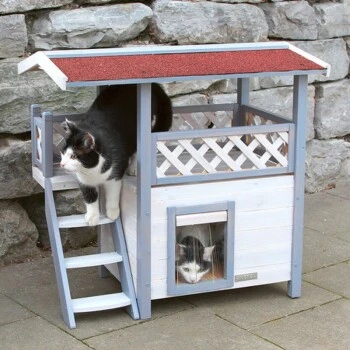 Im unteren Bereich befindet sich eine Art Höhle, die mit einer Schwingtüre mit Lamellen versehen ist. Dadurch ist die Katze vor Wind und Kälte geschützt. Die obere Ebene kann über die seitliche Treppe erreicht werden und dient als Aussichtsplattform.