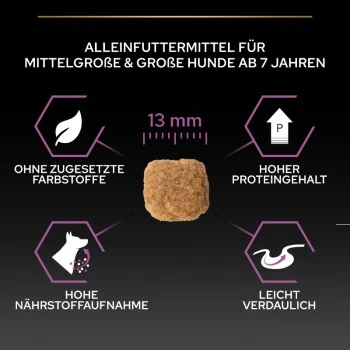 Unser vollwertiges Hundefutter mit Huhn ist speziell auf die Bedürfnisse von Hunden mittelgroßer bis großer Rassen ab 7 Jahren abgestimmt. Das Seniorenfutter enthält qualitativ hochwertige Stücke vom Huhn und ist zudem für eine umfassende Zahnpflege für Hunde konzipiert worden.