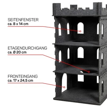 Das mit Filz-Zinnen umrandete Dach bietet der Katze die beste Aussichtsmöglichkeit, auf welchem sie in optimaler Höhe Ihr gesamtes Reich im Auge behalten und Neuankömmlinge früh erspähen kann. Ein natürlicher Lichteinfall in das Innere der Burg ist durch die großzügigen Fenster auf allen Etagen gewährleistet. Die Fenster sind groß genug, um dadurch z. B. nach einer Katzen Spielangel zu greifen oder andere Spielzeuge zu fangen.