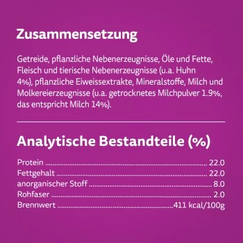 Die Minisnacks von Whiskas Milch-Kätzchen sind perfekt abgestimmt auf kleine Leckermäuler, reich an Milch und damit Kalzium, das zur Förderung eines gesunden Zahn- und Knochenwachstums beiträgt.